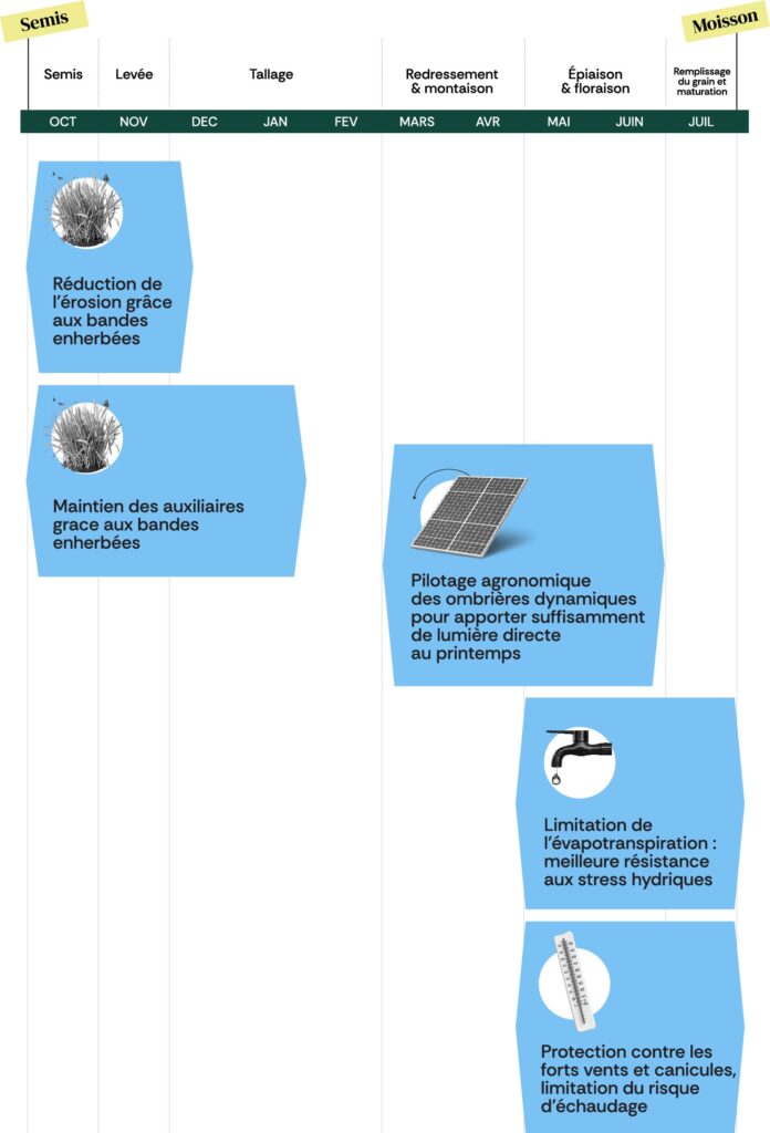 Pour pouvoir apporter un ombrage partiel, tournant, et optimisé aux moments clés du développement des cultures d’hiver ou de printemps, et adapté aux conditions météo